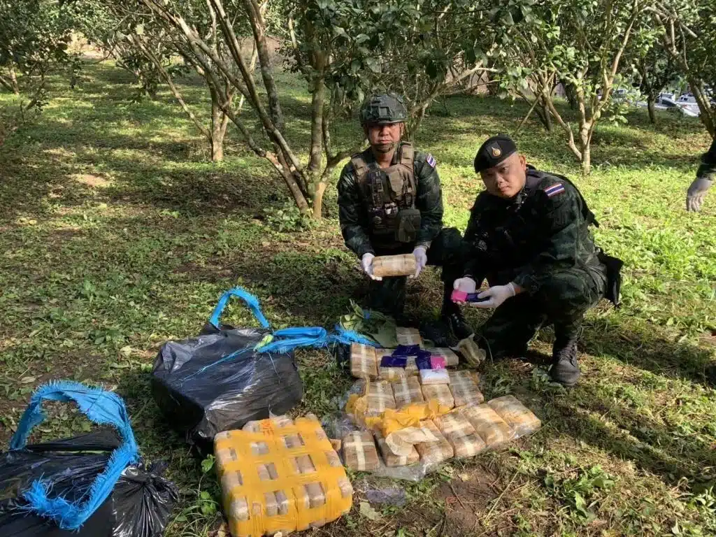 In a separate drug discovery the previous day, narcotics suppression officers received a tip-off that suspicious bags had been spotted in a pomelo orchard behind Kaeng Phan Tao village in Chiang Dao district. Multiple units, including the Joint Operations Unit (SPS.3), Taskforce Phamuang, and Chiang Dao Police, responded to the scene.